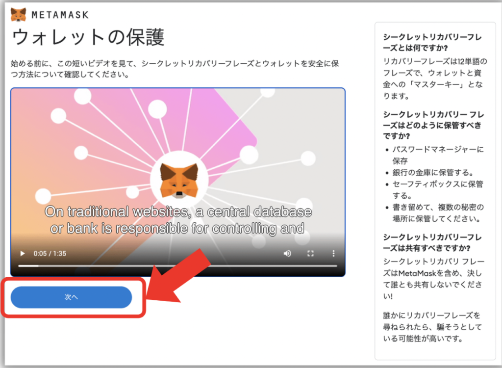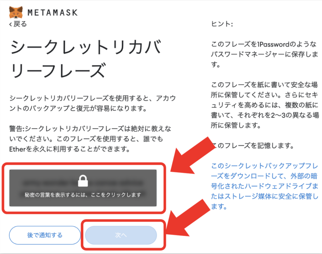『🔒』アイコンをクリックし、表示された秘密鍵をメモしたら『次へ』をクリック